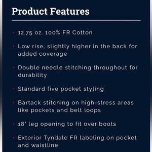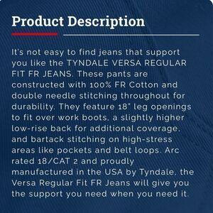 Tyndale Versa Regular Fit FR Jeans ~ style J24MT ~dark denim 38/30~ARC rating 18