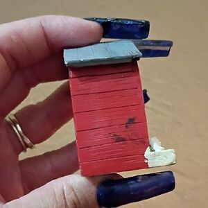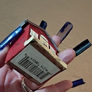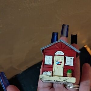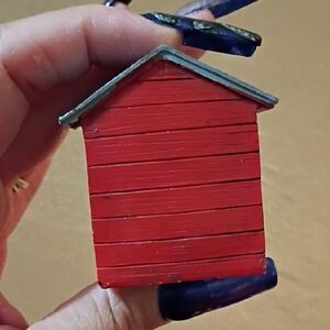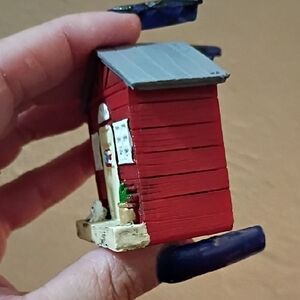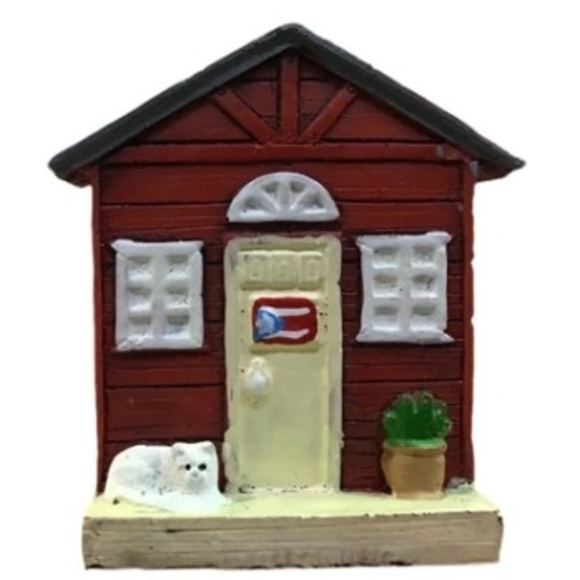 Charming red miniature house decor with white accents. Features a small plant and a cute cat figure.