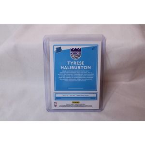 Tyrese Haliburton Donruss Rated Rookie Panini #231 is a basketball trading card featuring the talented point guard from the Sacramento Kings. The card showcases a high-quality image of Tyrese Haliburton in his team's uniform, with his name and team logo clearly displayed at the bottom. The card features a vibrant and colorful design with a classic look that is instantly recognizable to basketball fans and collectors. The back of the card provides key statistics and information about Haliburton's career, including his impressive rookie season performance and personal highlights. This card is highly coveted by fans and collectors alike, as it represents the exciting potential and future of one of the NBA's brightest young stars.