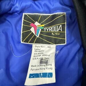 This classic one-piece ski suit features a bold 80s/90s blue-and-black colorblock design with a warm quilted interior, full front zip with snap placket, and elastic waist for a comfortable, flattering fit. Includes ankle zips, cuff snaps, and iconic Tyrolia logo zipper pull. Perfect for skiing, snowboarding, or retro winter style.