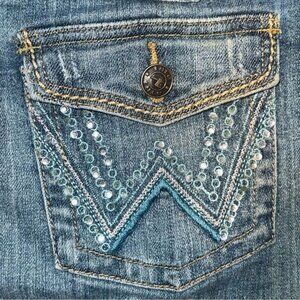 This Tyte denim skirt features a mid-rise waist with a raw-edge hem and distressing for casual charm. Embellished back pockets and contrast stitching add stylish flair to this women's vintage-inspired piece.