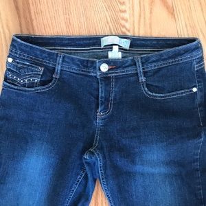 Five pocket low rise jeans straight leg with rhinestone embellishments and stitching on the pockets