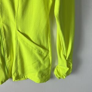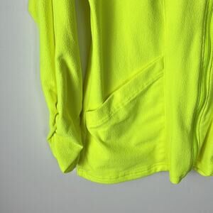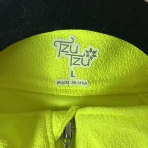Gently Used Tzu Tzu Full Zip Long Sleeve Top. This is a women’s large. Bright yellow / green neon color throughout. Front pockets. Unique texture to the fabric, kind of reminds of a tennis ball. Lightweight and cute! Made in USA.