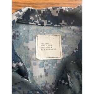 U. S. Navy digital pattern blue camouflage button front collared jacket size Small - Short. Five buttons in front. Two large front pockets. Each arm has a pocket. Height 63-67”. Chest 33-37”. NSN No. 8405-01-540-2369. Goid pre-owned condition.