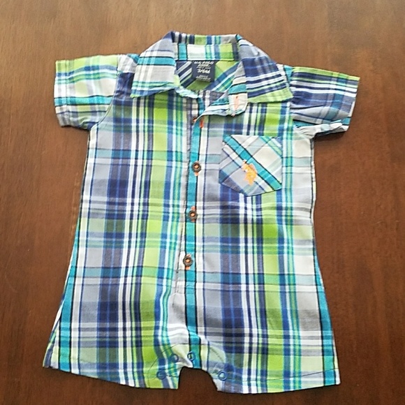 Blue lime green white and gray u.s.polo romper with logo pocket on front and 2 pockets on back,excellen condition no stains no wear and tear. Size 3/6 months Orange buttons holes and polo logo Orange adorable