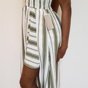 Skort Dress 👗 😍 Step out in style with this U for JustFab junior dress featuring a trendy striped design in green and white. Crafted for comfort and appeal, it showcases a smocked bodice and flowing skirt, perfect for any occasion. Key Features include: - Elegant smocked top for a flattering fit - Flowy skirt with chic slit detailing - Eye-catching green and white stripes for a fresh look - Brand new with tags, originally purchased at Ross - Size L for a comfortable fit. Elevate your wardrobe with this must-have dress!