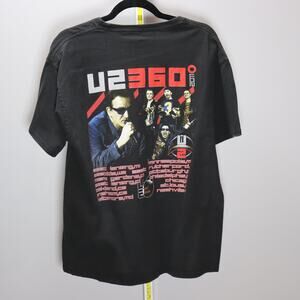 Authentic U2 “360° Tour” 2010 concert tee featuring front and back graphics from the tour. Printed on a Hanes Tagless 100% cotton black shirt, size Large. Soft, worn-in feel with natural fading typical of true vintage band merch. A great collectible for U2 fans or graphic tee collectors. Good condition with no holes; minor fade and wear appropriate for age.