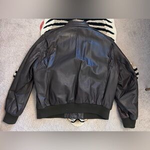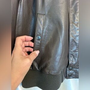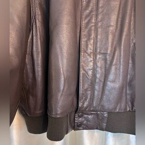 This classic bomber jacket from U2 Wear Me Out features a rich, dark brown genuine leather construction with ribbed cuffs and waistband. Its timeless design and smooth leather finish make it a versatile addition to any wardrobe.