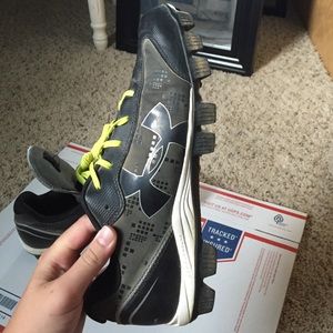 Under Armour cleats. Worn for one season. They do have dirt/sand on them. Would be very easy to remove or wipe off. They are in great condition. Not a scratch. Prefect condition except for the dirt.