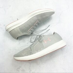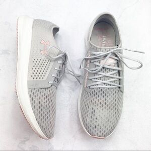 Under Armour UA Sway Running Shoes. Gray & Pink. Light, Breathable Mesh. Molded Quarter for Support for back half of foot. Sock burrito tongue for a closer fit & foot guidance. Minimalistic interior heel for added support without extra weight. Die-cut, full-length EVA sockliner for added step-in comfort. Ultra-lightweight, one-piece foam midsole engineered to give responsive ride. Great sole for traction & durability. NWT / New with Tags. No Stains. No Rips.