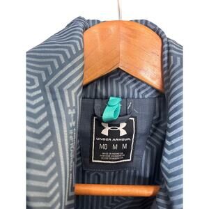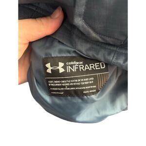 Stay warm and dry with this technical Under Armour jacket! This outerwear piece features UA Storm 2 water-repellent technology for excellent weather resistance and ColdGear Infrared lining, which uses a soft, thermo-conductive coating to absorb and retain your body heat without adding bulk. The dark blue/gray exterior has a subtle texture, while the hood lining has a unique geometric pattern in gray and teal for a pop of style. An excellent pre-owned condition jacket for your outdoor activities or everyday wear.