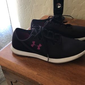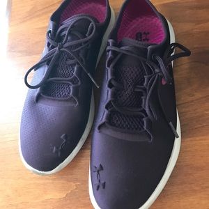 Purple UA Flows! Super cute and comfy! Have been worn, but in good condition. My dog chewed one of the plastic part of the shoe lace, but that is easily fixable!