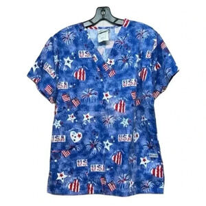 Keywords: UA Scrubs, women's blouse, V-neck, multicolor, geometric pattern, patriotic, American flags, stars, 3 pockets, comfortable, cotton blend, healthcare, casual wear, pre-owned.