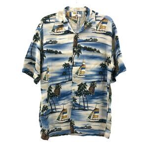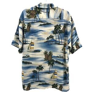 UBC MEDIUM VINTAGE 80s Cream Hawaiian Aloha Dad Shirt Cream Blue Ocean Pineapple Palm Tree Beach Island Sailing