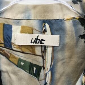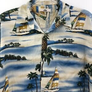 UBC MEDIUM VINTAGE 80s Cream Hawaiian Aloha Shirt Blue Ocean Palm Beach Island