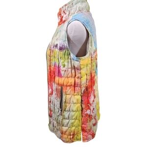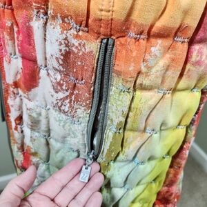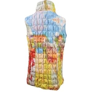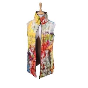 Beautiful fully reversible quilted vest in artistic color print, reversing to a solid metallic color