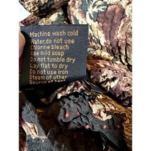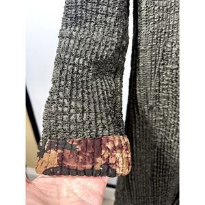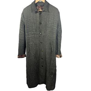Button front closure. Long sleeves. Spread collar. Two hip pockets. Midi. Reversible. One side is shades of brown with leaf pattern throughout and gold toned plastic buttons. The other side is solid army green with green plastic buttons. Wrinkle resistant. Stretch material. Packable. Travel. Lightweight. Versatile.