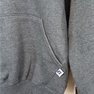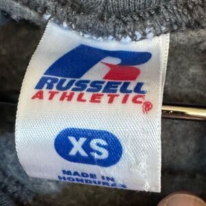 Experience the perfect blend of comfort and style with this Russell Athletic gray sweatshirt with raised lettering, killer college hoodie, it features a classic collegiate design with ribbed cuffs and waistband NO DRAW STRINGS, smoke free, ready to go