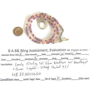UE# Beautiful 16” Amethyst crystal & Sterling 925 Silver Beaded Necklace We work hard to find high quality fine jewelry for our buyers. This item is sourced from an estate sale and the former owner had exquisite tastes. The great craftsmanship make this item a true work of art and with its pristine condition It is truly A great value of fine jewelry at costume pricing! Let’s make it yours!