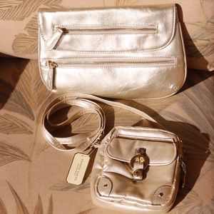 Pebbled Vegan soft gold leather. 2 outside zippered compartments, inside zipped compartment and pockets. detachable strap. Original wrapping intact on strap, brand new purse.