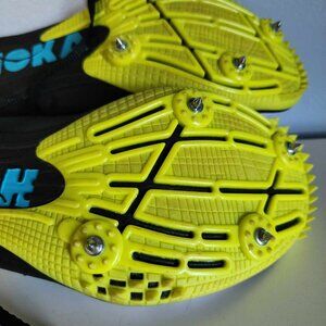 These Hoka Track Shoes were worn a few times, and are in excellent condition. The only marks on them is a bit of red clay dust from the track. Spikes are still in tact, and comes with spike lock.