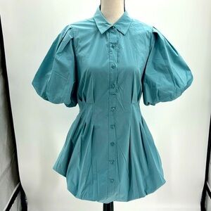 A crisp poplin dress with dramatic puff sleeves and a pleated bubble hem.
