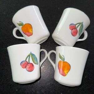 Vintage Set of 4 Corning Fruit Basket Coffee Cups- Corelle Mugs Cherries & Apples. In excellent vintage condition, no chips, cracks, or notable damage.