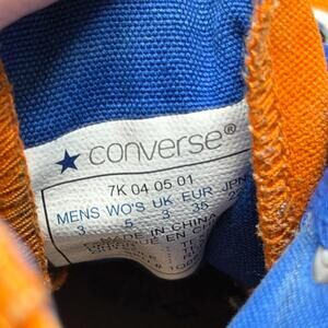 The product is a pair of women's Converse high top sneakers in blue and orange, representing the University of Florida. These athletic shoes have a lace-up closure, canvas upper, and are designed for casual occasions. The size is 5 US, 3 UK, and 35 EU, making them suitable for a variety of activities, including tennis. The sneakers feature the Converse brand logo and are customized with the University of Florida theme, making them a stylish choice for fans of the team or the university. Women's 5 and Men's 3.