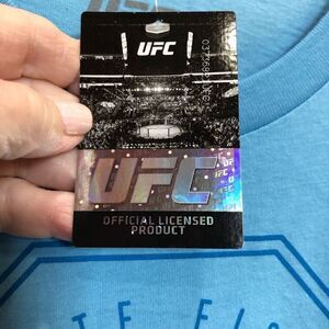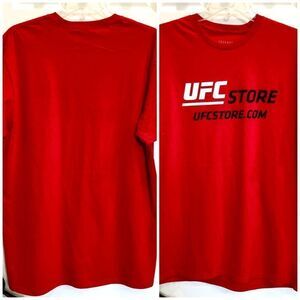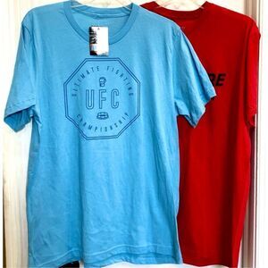 UFC Officially Licensed "Simple Octagon" crewneck, short-sleeved T-shirt in men's size LARGE. The color is light blue. ALSO INCLUDED is a Legends brand red T-shirt with the logo "UFC Store". Two tees for the price of one! The blue tee has the graphic "UFC Ultimate Fighting Championship". Both of these are 100% cotton, so machine wash and tumble dry. The pit-to-pit measurement on both is 22", the length is 29" and the sleeves are 9". Great deal for a UFC fighting fan and they are brand new!