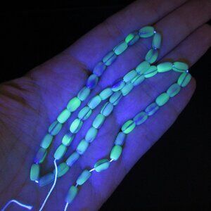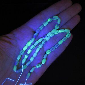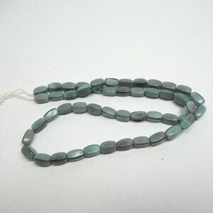 This listing is for the strand of 50 vintage light grey Czech Uranium glass beads pictured. They have never been used, are vintage stock and come temporarily strung on the original factory string. These beads are a fun squared off rectangle shape and are a beautiful light satin grey color with teal mixed through. They glow lightly under blacklight. Parts of these beads glow under blacklight because of the Uranium used in making and coloring the glass.