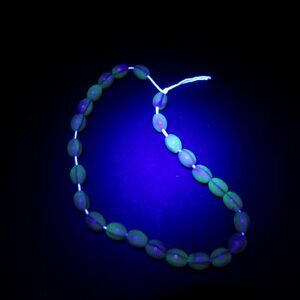 This listing is for the strand of 25 vintage pinky purple Czech Uranium glass beads pictured. They have never been used, are vintage stock and come temporarily strung on the original factory string. These oval or fat rice beads are beautiful pinky purple color. They glow lightly under blacklight. Parts of these beads glow under blacklight because of the Uranium used in making and coloring the glass.