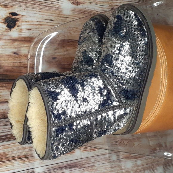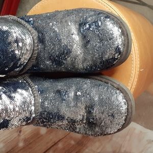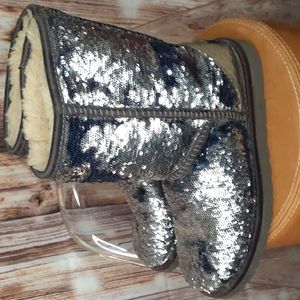 These are the sequin metallic boots that's black and silver. They are a size 5 and pre-owned in good condition. It has the sheepskin lining on inside. Great for the winter.
