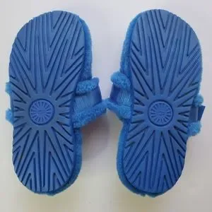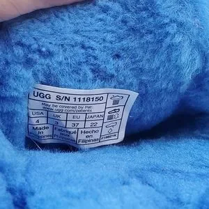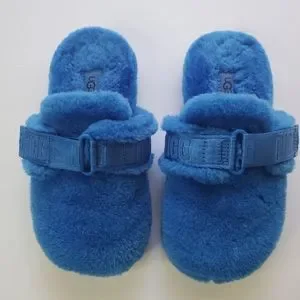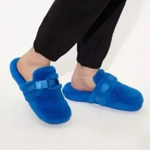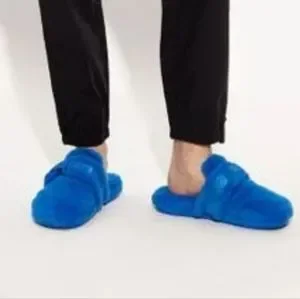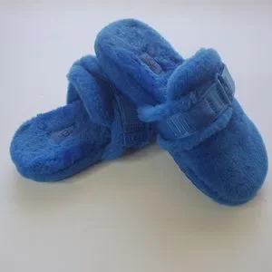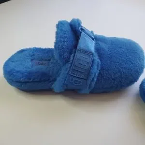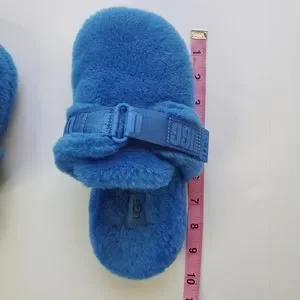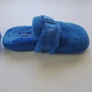 UGG "Fuff It" Slides. Blue Size 4. Measurement taken in 9 1/2 inches. Used, some wear, soles a little dirty, see photos. Features a velcro strap with logo and adjustable width. Soft wool & lyocell blend. PLEASE ZOOM IN ON ALL PHOTOS BEFORE PURCHASE. Please ask any questions