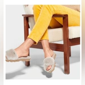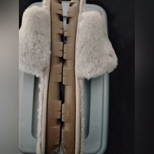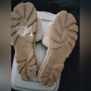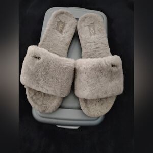 Experience luxury with UGG's fluffy slippers. Ideal for home relaxation or indoor/ outdoor. Condition: Pre-owned