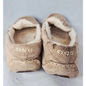 Style: Moccasin-inspired slipper with a round toe and decorative stitching.