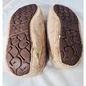 UGG Ansley Moccasin Suede Slippers in a chestnut or tan color. They are a classic slip-on style featuring water-resistant suede and a plush wool lining designed for comfort and moisture-wicking.