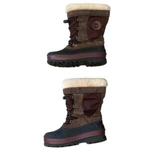 Preowned Gently Used UGG AUSTRALIA Bobbey Winter Snow Boots Brown Canvas Waterproof Size US 3 Youth Warm Rain. Great for snow and rain! The soles are in good condition with no heel damage. There are signs of wear present such as some fading. See pictures for condition. Lots of life left!