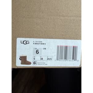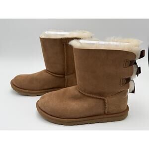 The UGG Australia Short Bailey Bow II Chestnut Suede Sheepskin Boots in size US 6 for women are a stylish and cozy choice for the winter season. These mid-calf boots feature a pull-on closure, low heel, and a medium width for a comfortable fit. The chestnut color and bow accent add a touch of elegance to the solid design, making them a versatile option for snow and winter wear. With wool insole material and sheepskin lining, these boots provide both warmth and luxury for colder weather.