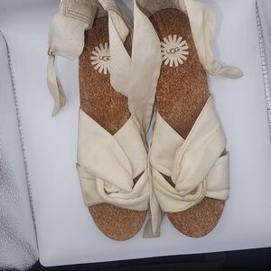 UGG Australia Women's Creme Espadrilles Cork Wedge Sandals, US Size 7.5. These stylish sandals feature a comfortable cork footbed and a classic espadrille wedge heel. The creme fabric straps tie around the ankle, providing a secure and chic fit. Excellent pre-owned condition, perfect for spring and summer outings. Made in China. This sandal has been worn very small signs of wear.