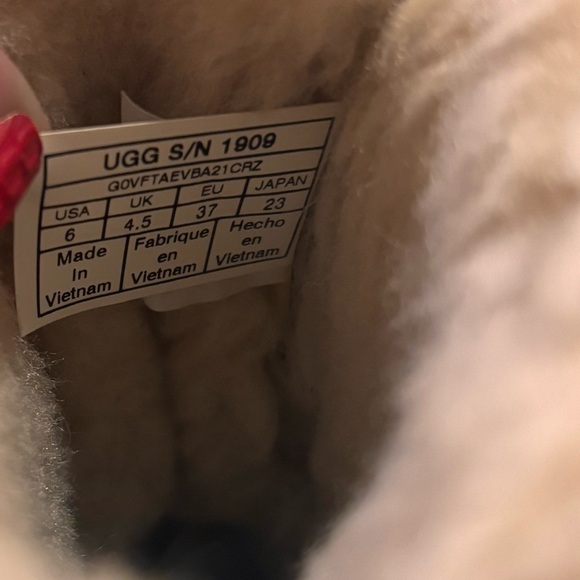 The UGG Adirondack II Waterproof Leather Boots in Sand color and size 6 feature a Vibram sole for traction. These mid-calf boots have a round toe and lace-up closure. Made with sheepskin lining and insulation, they provide comfort and warmth. The rubber outsole offers non-slip grip, making them suitable for activewear and casual occasions. Preowned condition. Front rubber part of toes detaching a bit as shown in photos.