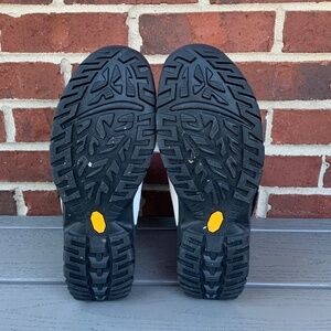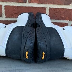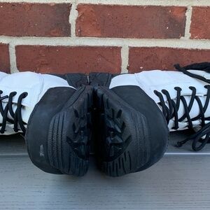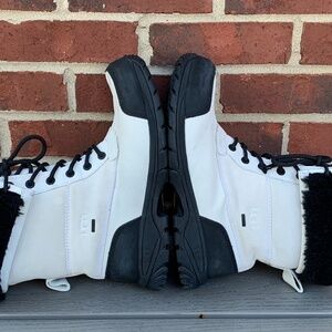 A DryTech waterproof finish adds practicality to the rugged look of this lace-up boot by UGG. Features a 1 1/2" heel, 7" shaft, lace-up style, temperature rating to -32 degrees Fahrenheit, removable insole, leather upper, UGGpure wool textile and faux fur lining, and rugged rubber sole. Excellent very gently used condition, with minimal marks/creases throughout and minor wear/dirt to insoles and soles. Also minor wear to ends of shoe laces on left boot. Size 9.5. In hard to find white/black.