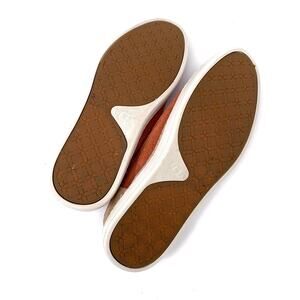 Ugg Adley Perf Slip On Sneaker in a burnt orange distressed suede. Perforated panel upper, leather heel cap in a light tan, rubber bottom sole. Suede has some dark spots, but is overall in great condition!