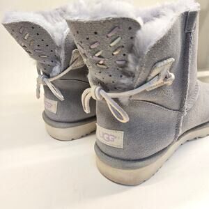 UGG® winter boots made of high-quality leather suede with insole and lining made of sheep wool and trimmed with soft shearling. EVA sole. Perforated and woven back panel at heel, tied with rawhide strap. Branded patch on the back. Style No. 1016665. Light grey with lavender accents.