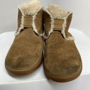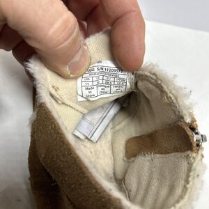 The UGG ankle boot for toddler size 11 is a stylish and comfortable option for young girls. This brown suede bootie features a solid pattern, round toe shape, and a low heel height for all-day wear. The rubber cleat type ensures good traction, while the moderate cushioning level provides added comfort. Perfect for casual occasions, these UGG shoes are a fashionable choice for any toddler girl who loves the brand's reputation for quality and style. These boots do have some wear, mainly in the toes area, see photos!