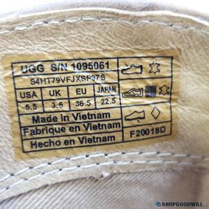UGG TAN LEATHER MID LENGTH BOOTS in very good condition. Small UGG Logo on Each Boot. The boots have a comfortable round toe, and are mid-calf length (approximately 7" from the top of the boot to the start of the heel). The 2.5" heel has a western inspired design with cream stitching. The boots have side zippers for easy on and off. Keep the comfort UGG is known for, and add some style with these beautiful boots!