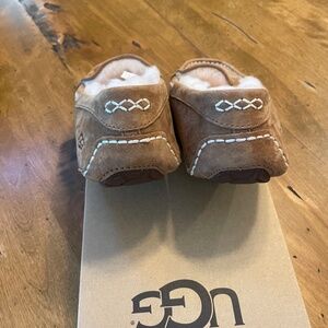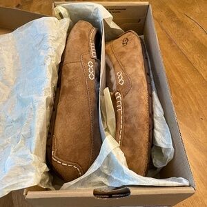 UGG women’s Ansley loafer-style slippers, size 8; Water resistant Suede uppers, thick wool-Sherpa lining, molded rubber outsole for indoor/outdoor use. Decorative stitching. Brand new in box, never worn!