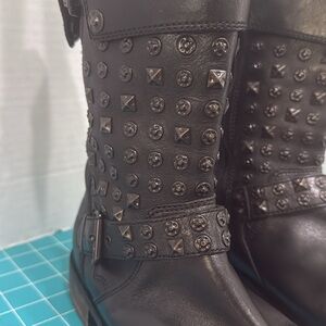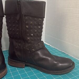 Step out in style with these chic black studded leather boots. Perfect for adding an edgy touch to any outfit. Boots have some wear but are in good condition, if they didn’t bother my instep I’d keep them. The wear adds to the overall look of the boot.