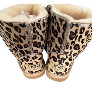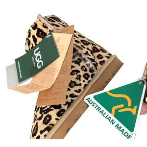 New with tags authentic UGG Australia Made boots in genuine sheepskin with bold leopard-print finish and ultra-soft wool lining. A rare, original Australian-crafted pair—luxurious, warm, and fashion-forward. Perfect for the current animal print and mob wife revival, as well as cherry coded and Y2K-inspired winter looks. Pairs effortlessly with leather skirts, cozy knits, or denim for fall and holiday wear.