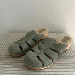 UGG Australia ORE Clog Sage green suede shearling cozy mule wooden sole sz 8