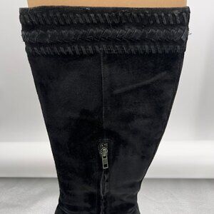 Stylish UGG tall black suede boots with wooden block heel and stud detailing. Features side zipper for easy wear and comfortable rubber outsole.